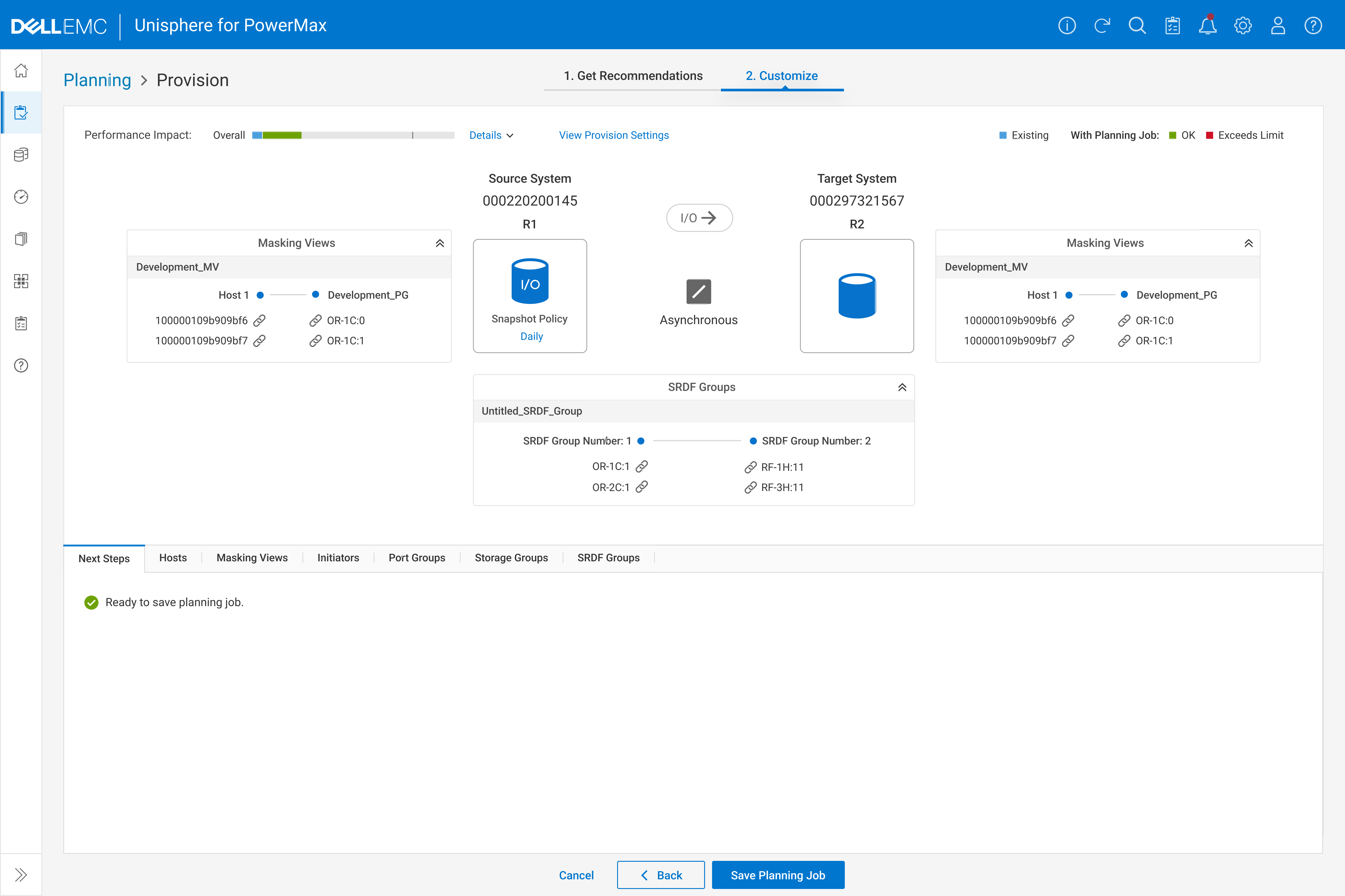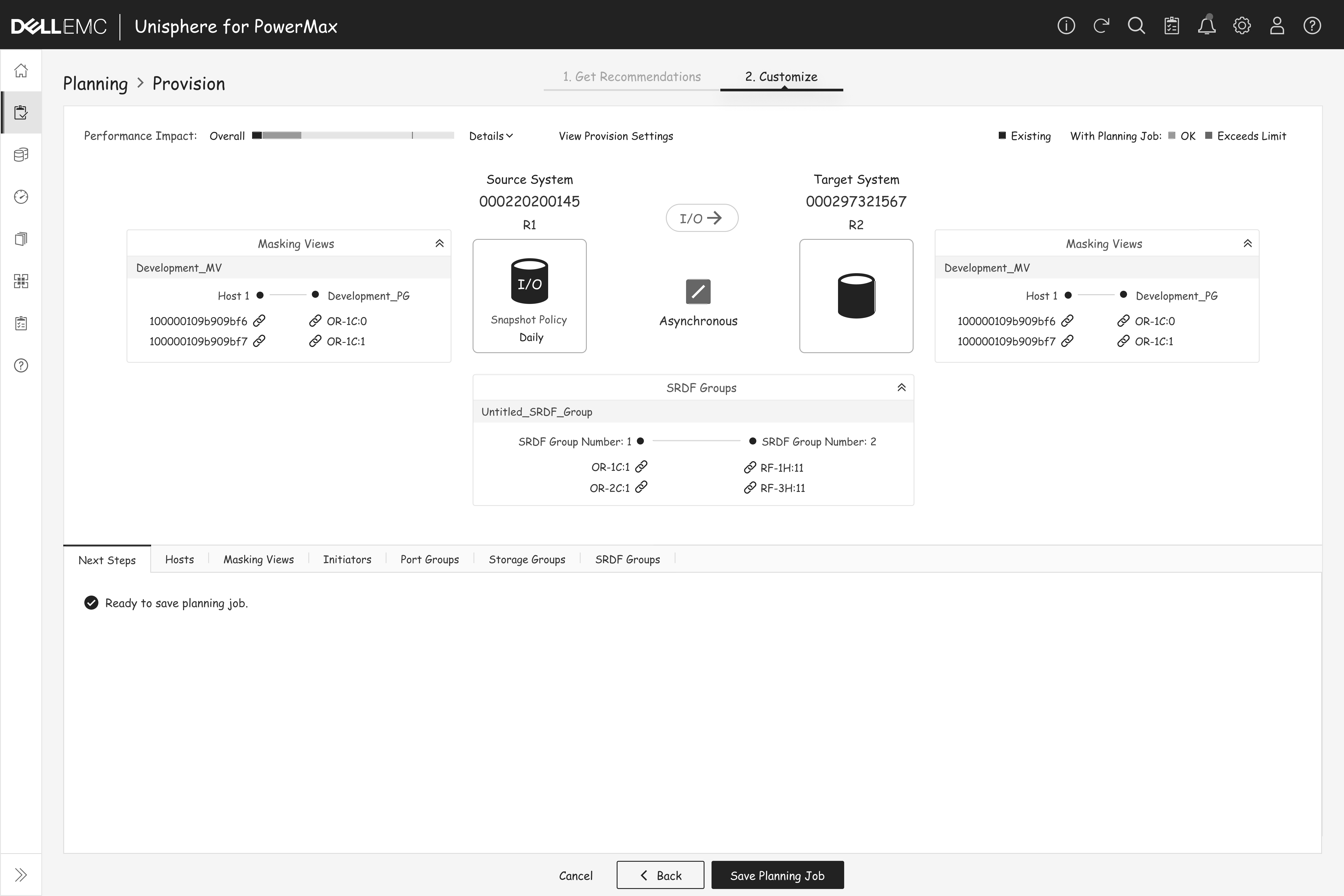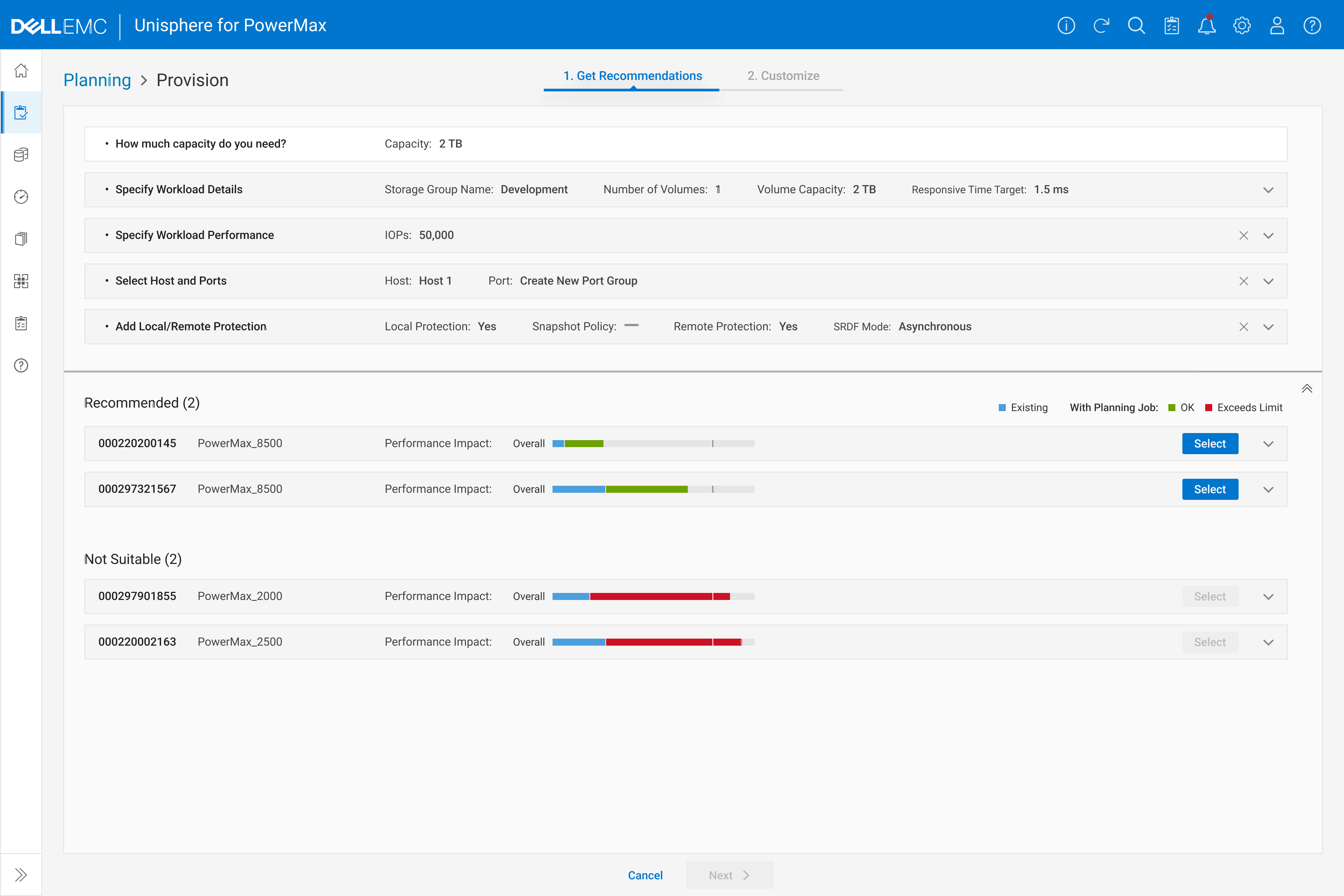 After the planning job is saved, PowerMax leverages AI to predict potential performance impacts on the systems. Based on these predictions, users can then decide whether to proceed with implementation.