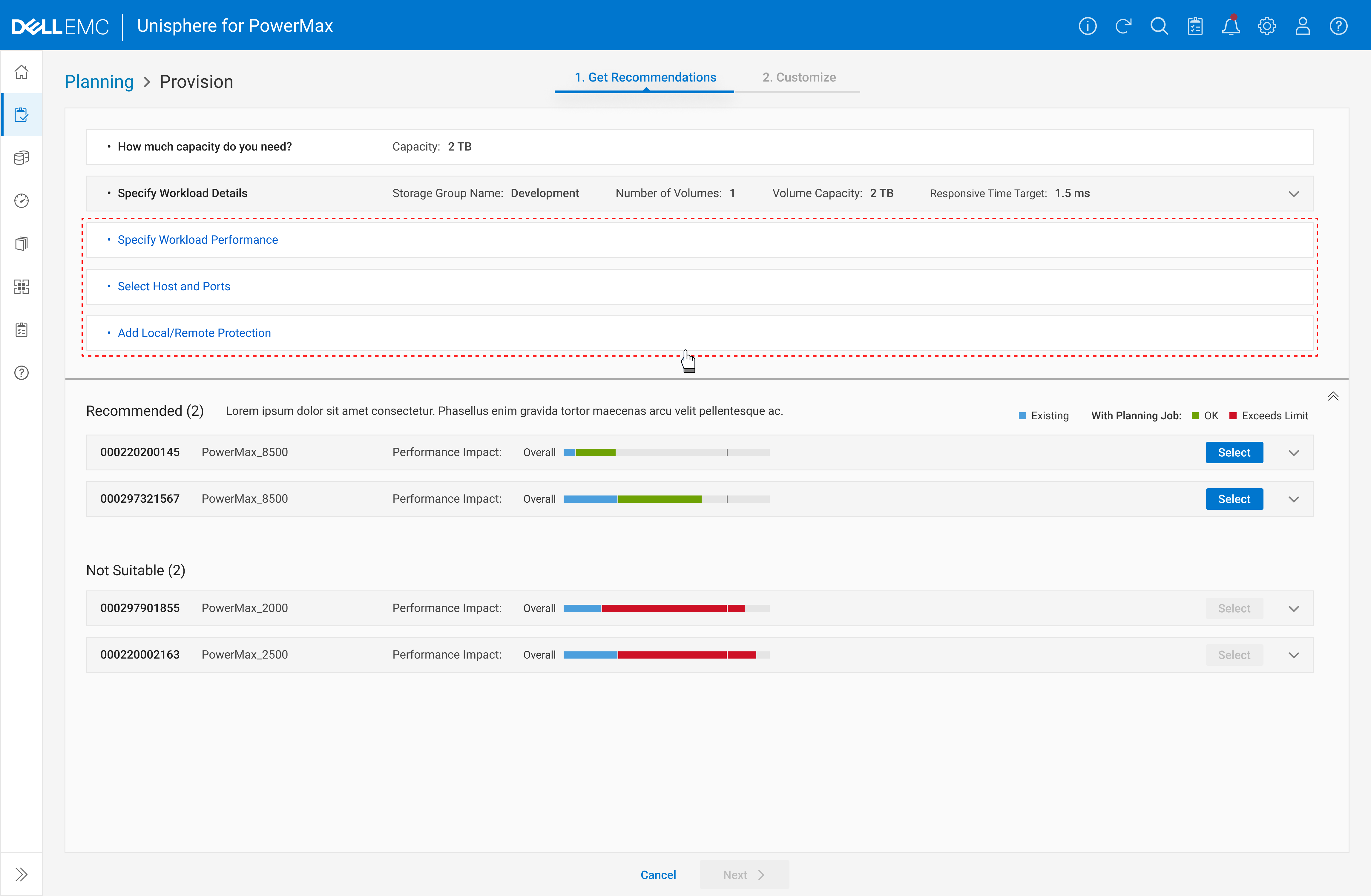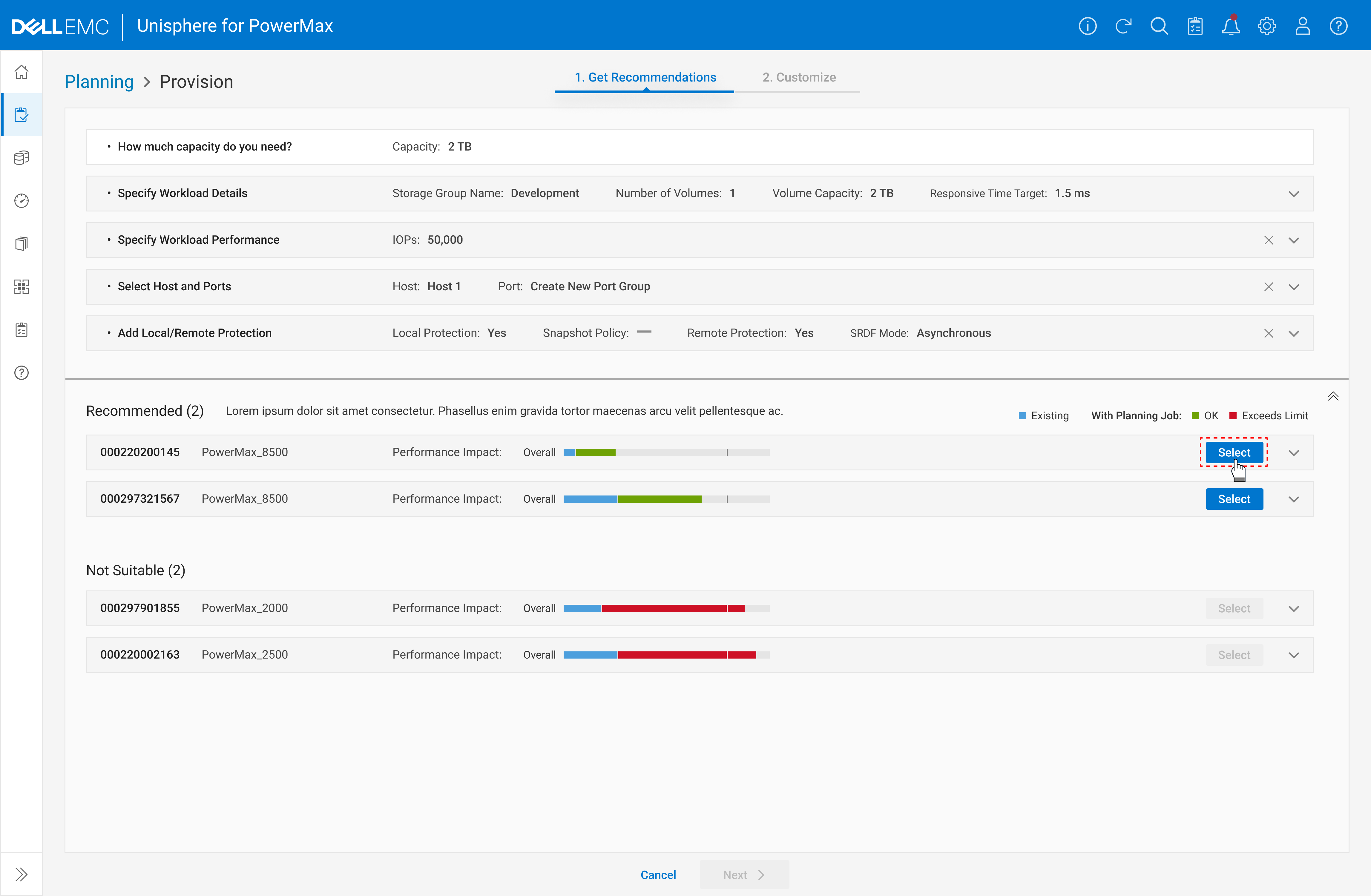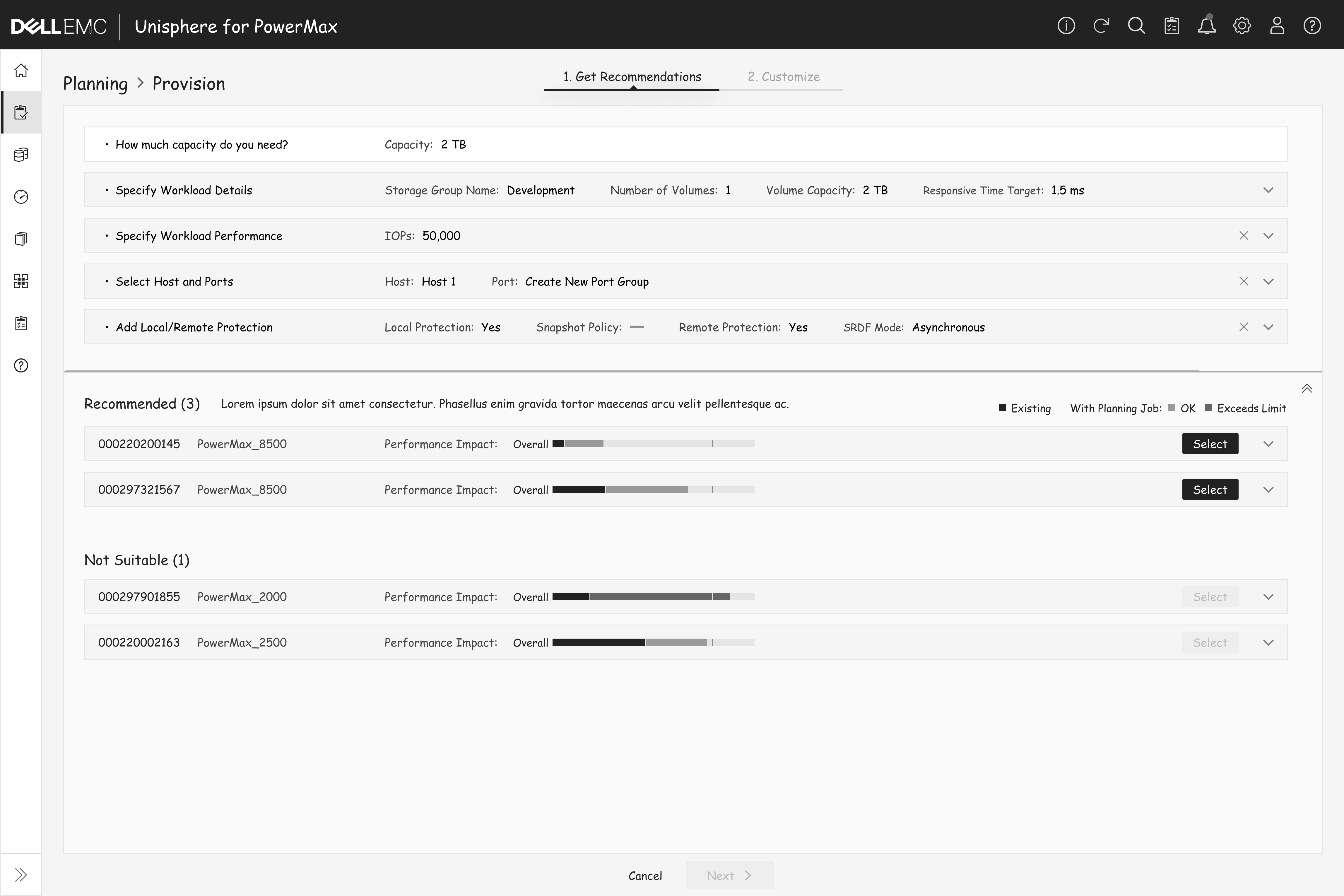 After the planning job is saved, PowerMax leverages AI to predict potential performance impacts on the systems. Based on these predictions, users can then decide whether to proceed with implementation.