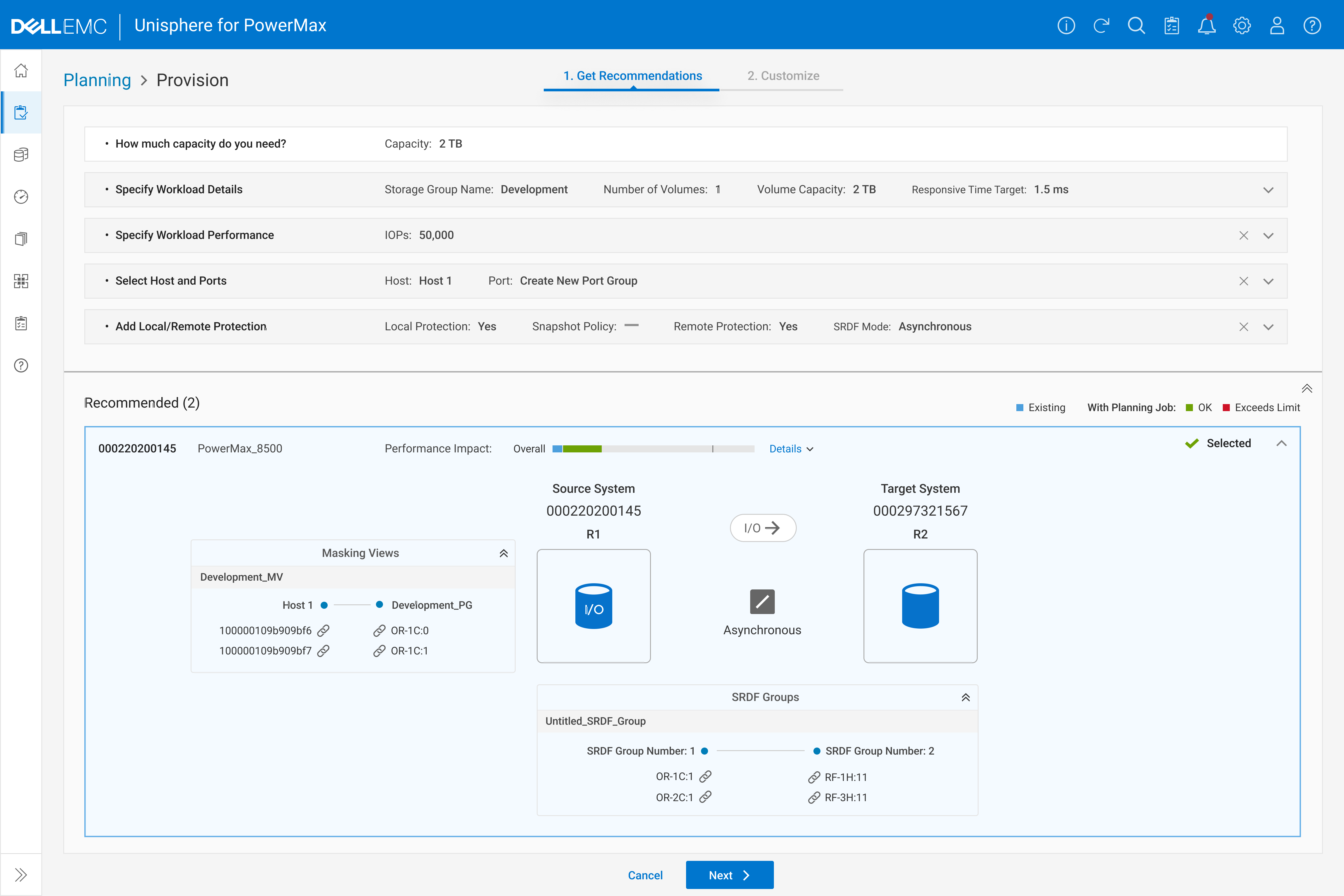 When users select the source system, PowerMax automatically recommends the most suitable target system. It also preselects the appropriate Masking Views and SRDF Groups to establish the connection.