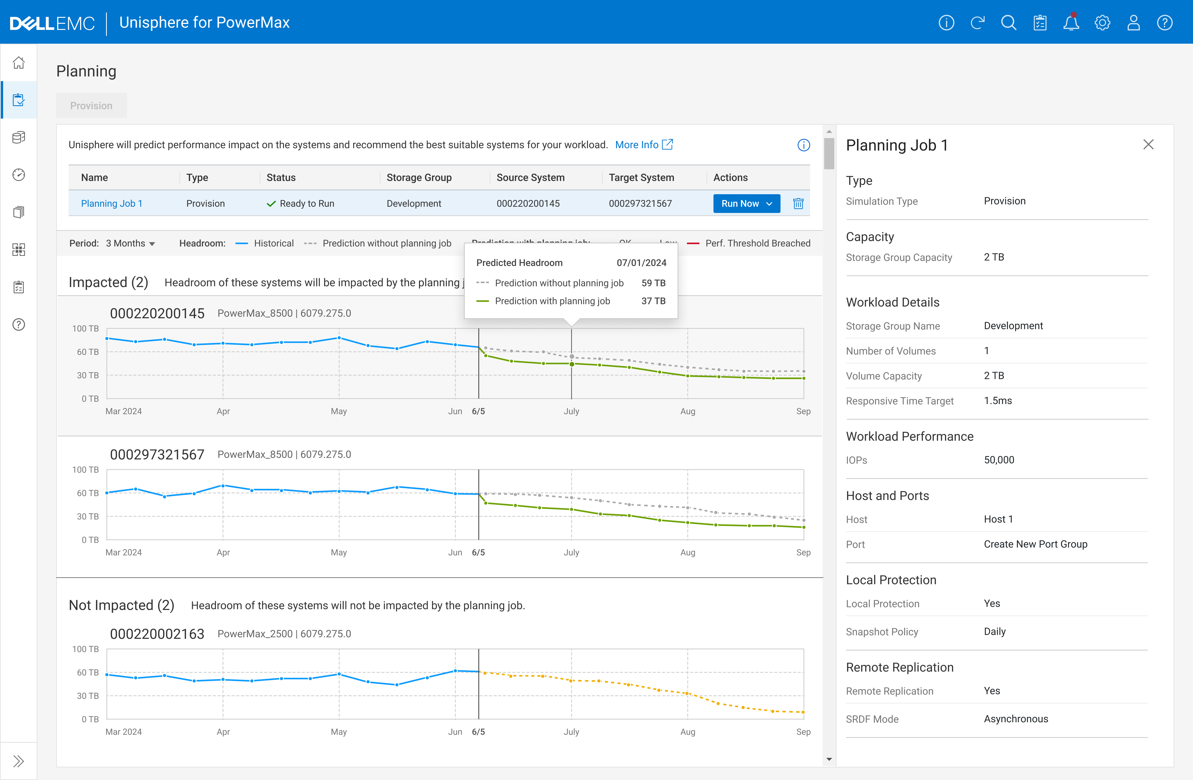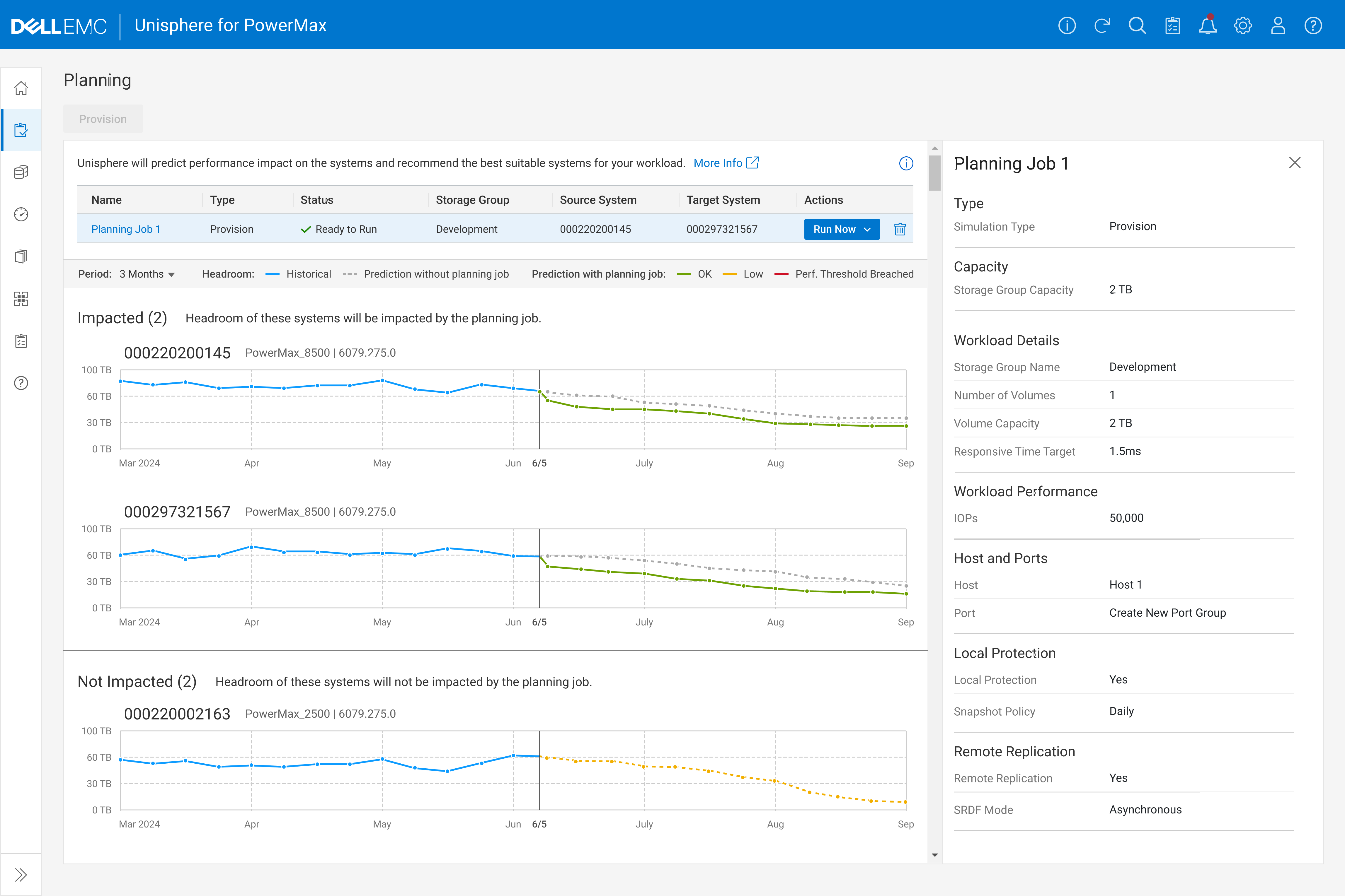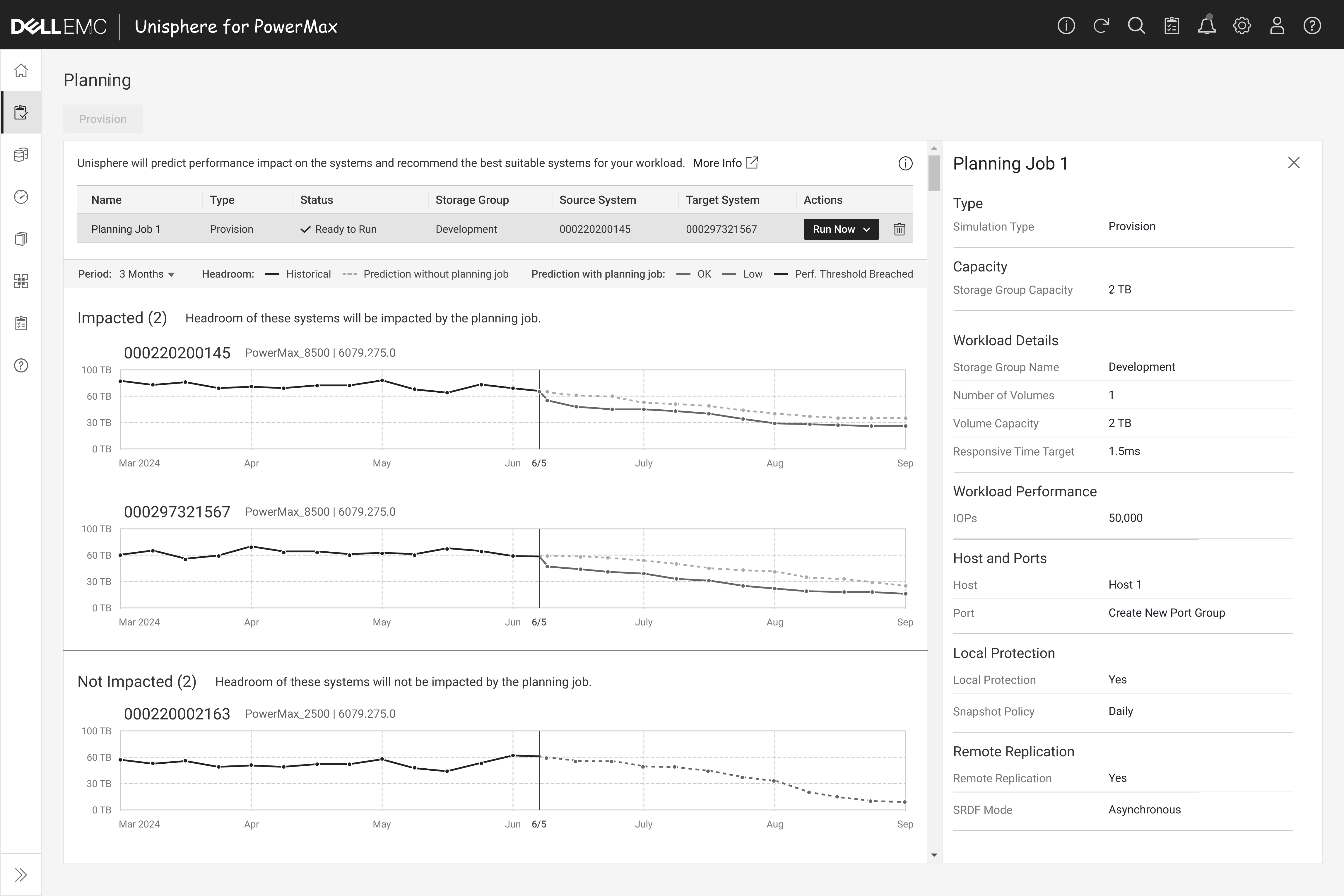 Once the planning job is saved, PowerMax uses AI to forecast system impact over the next three months—helping users make informed provisioning decisions.