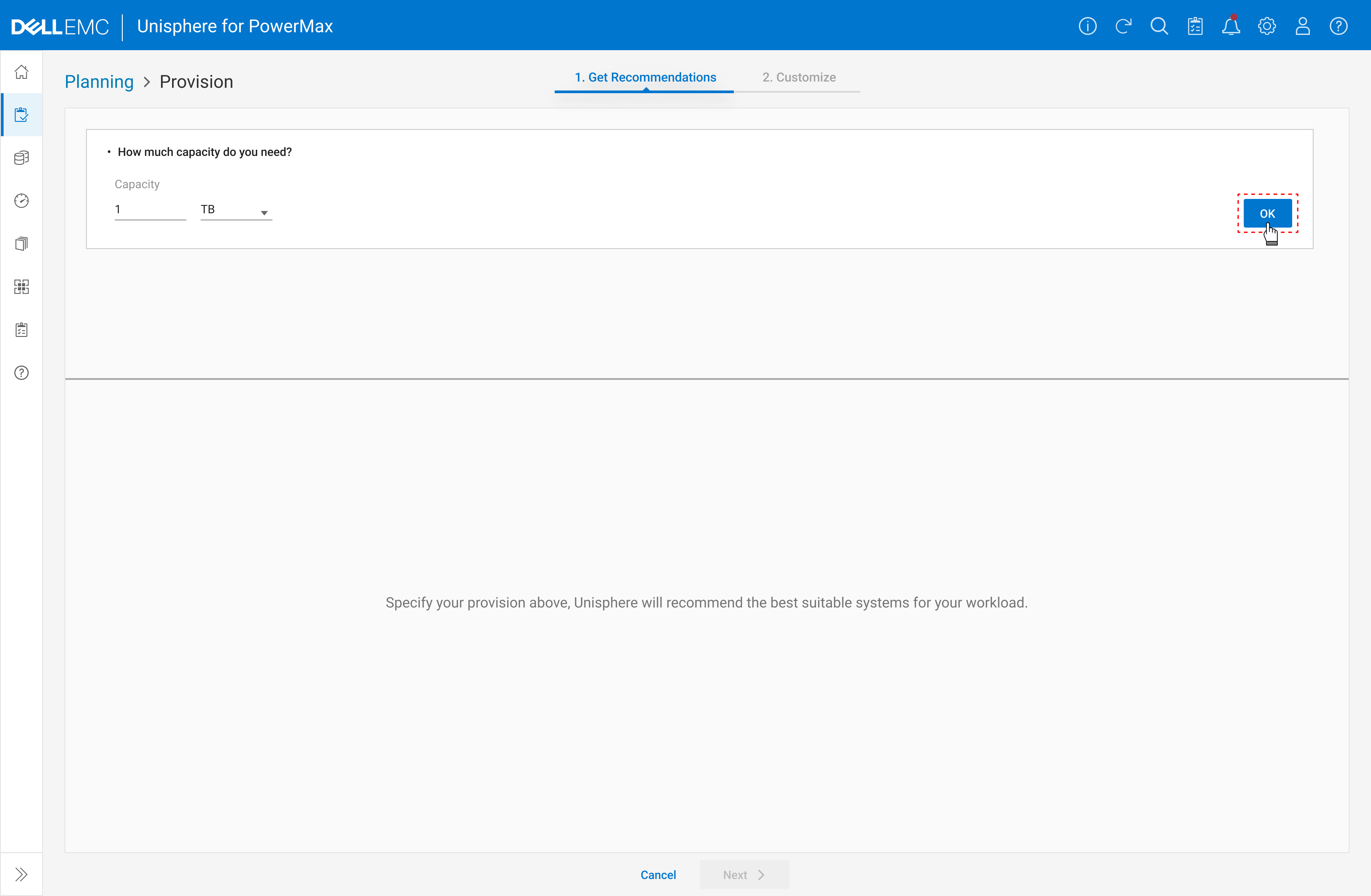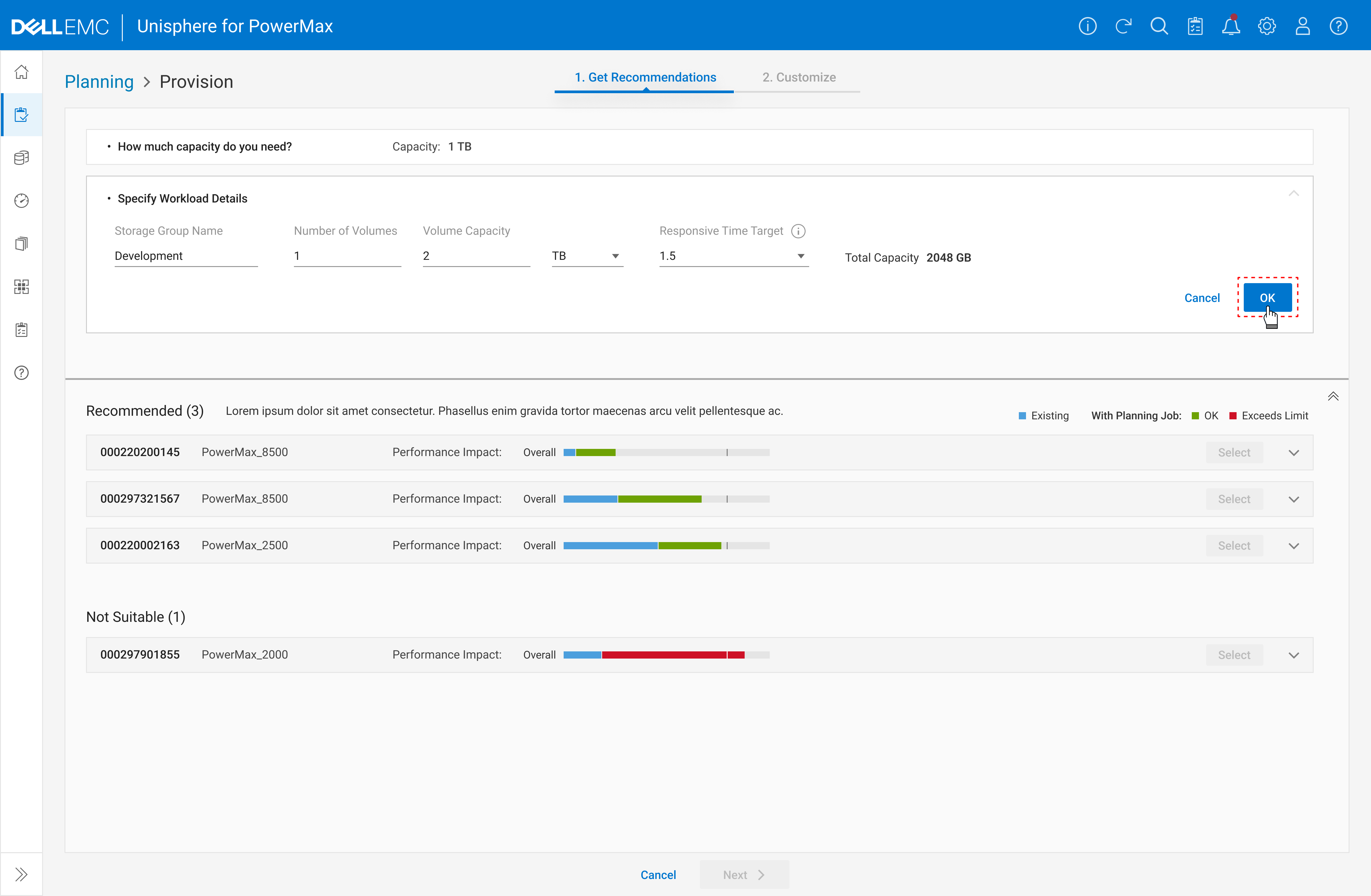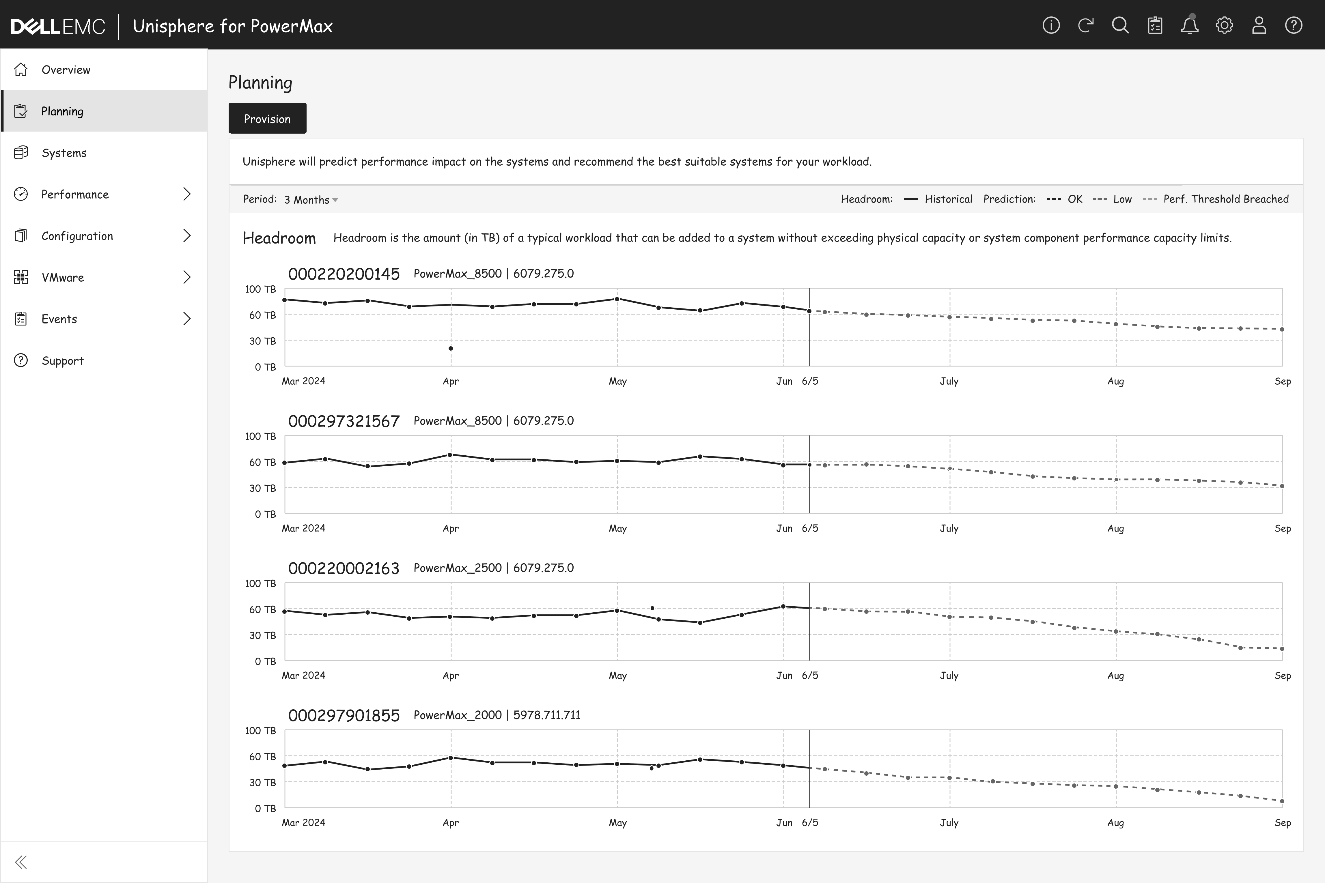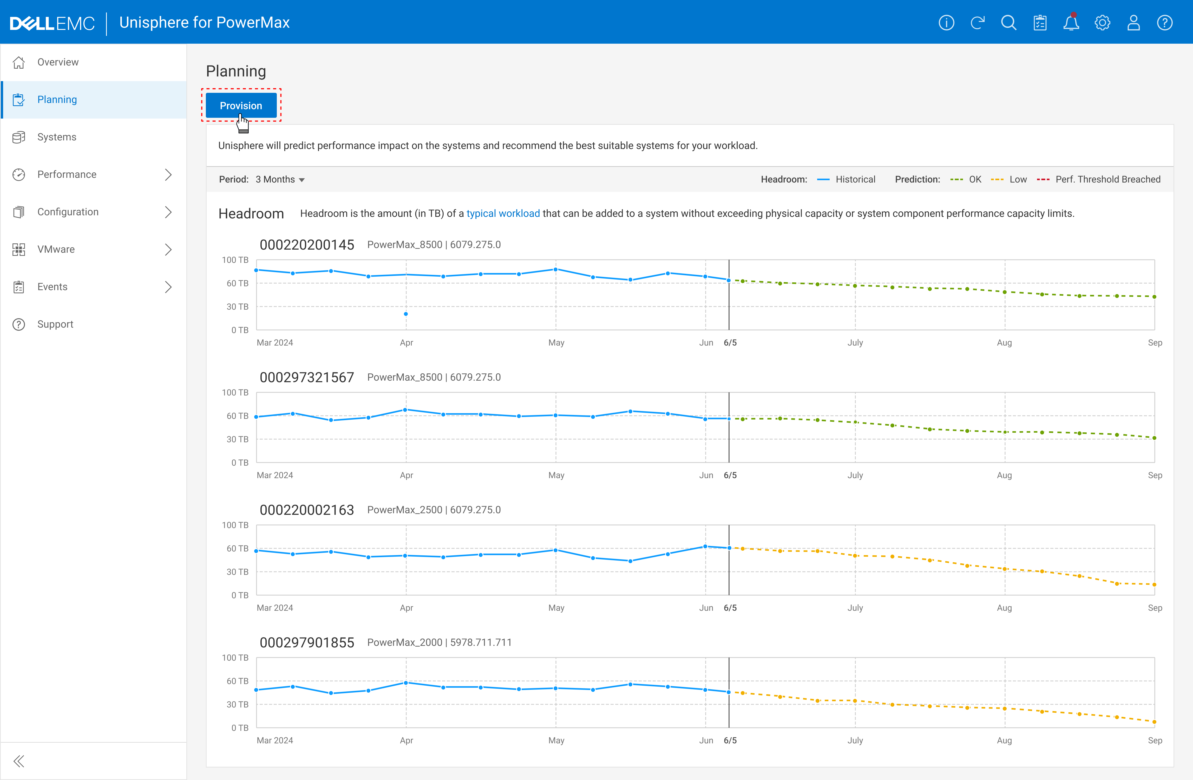 Once the planning job is saved, PowerMax uses AI to forecast system impact over the next three months—helping users make informed provisioning decisions.