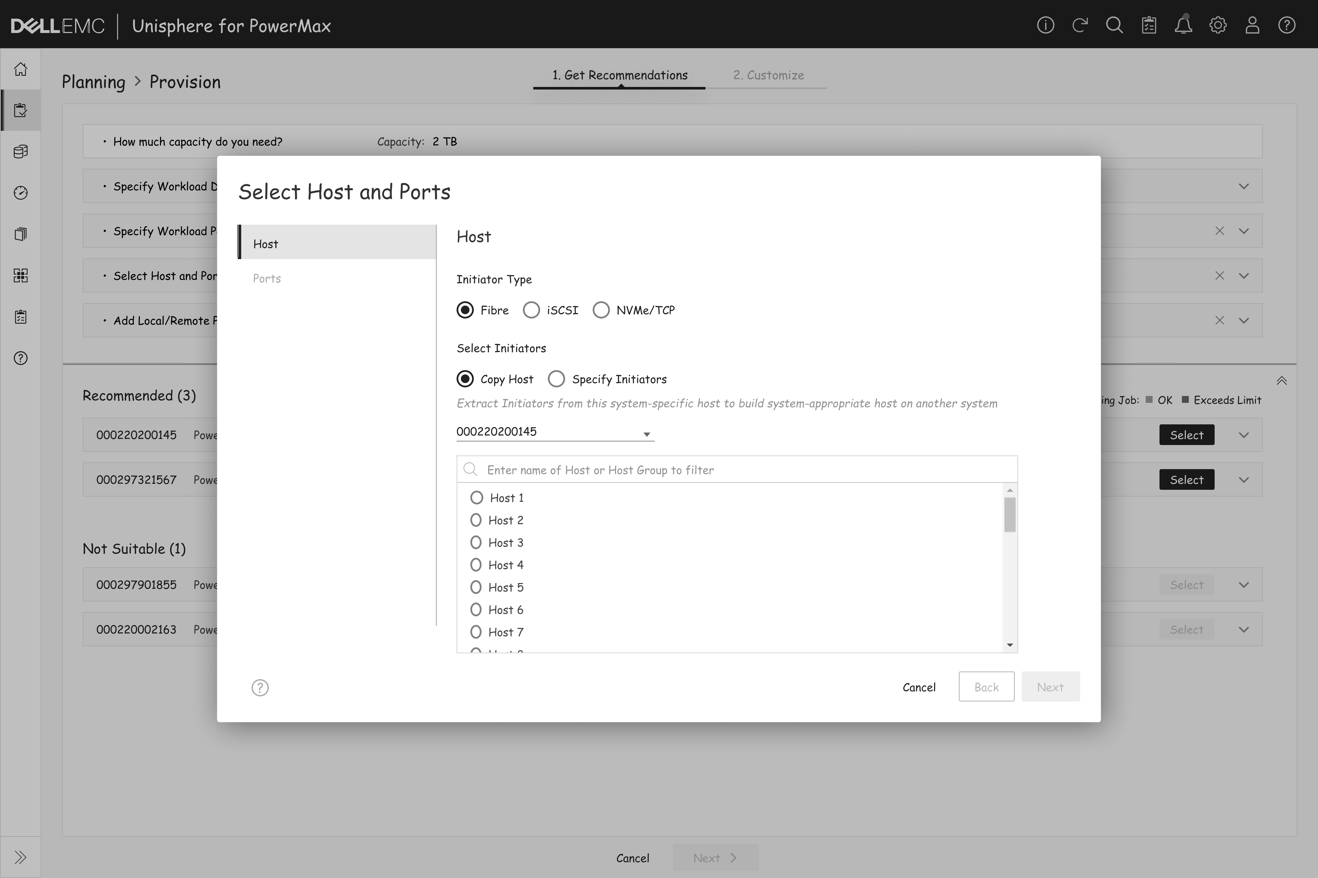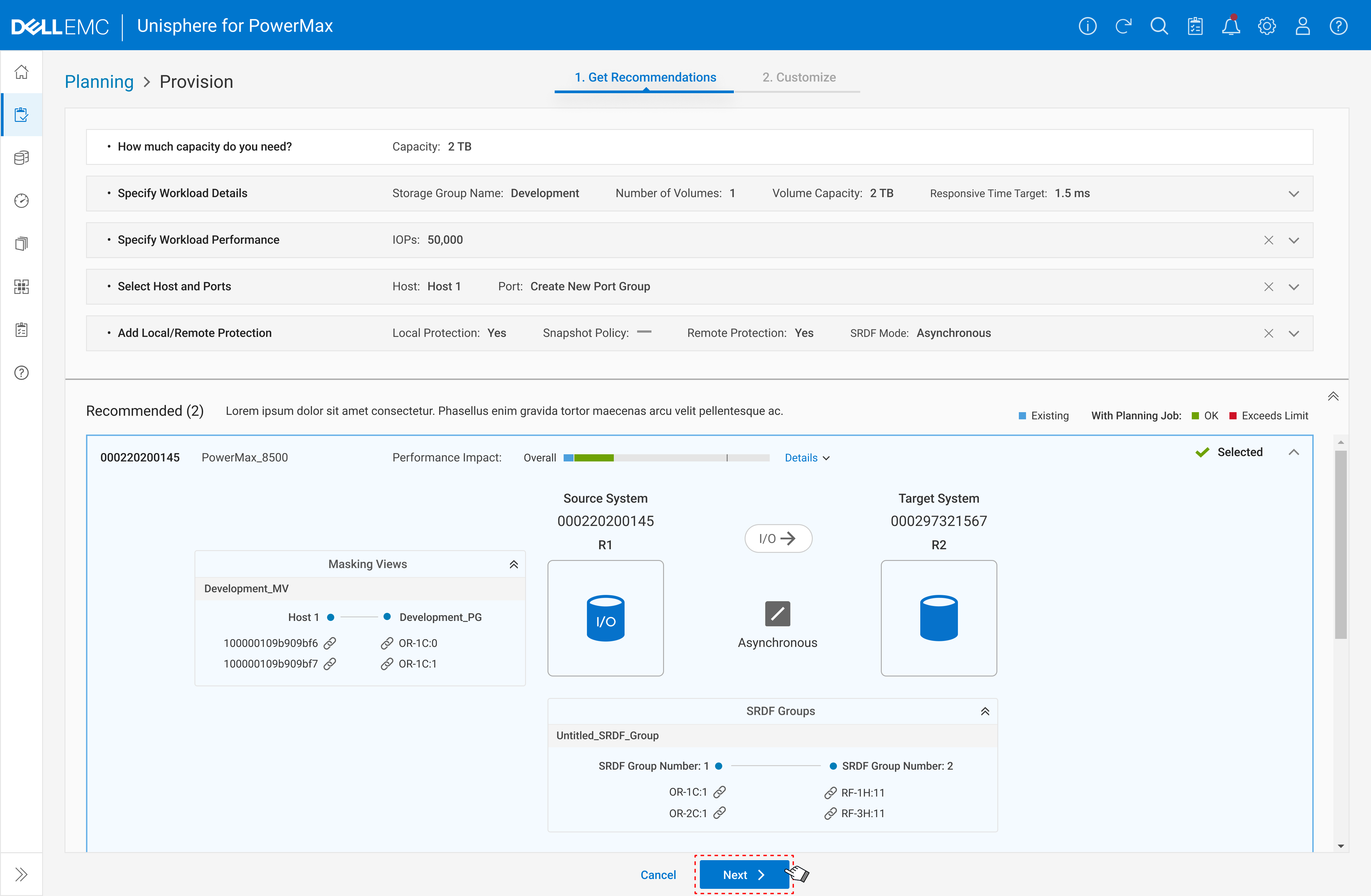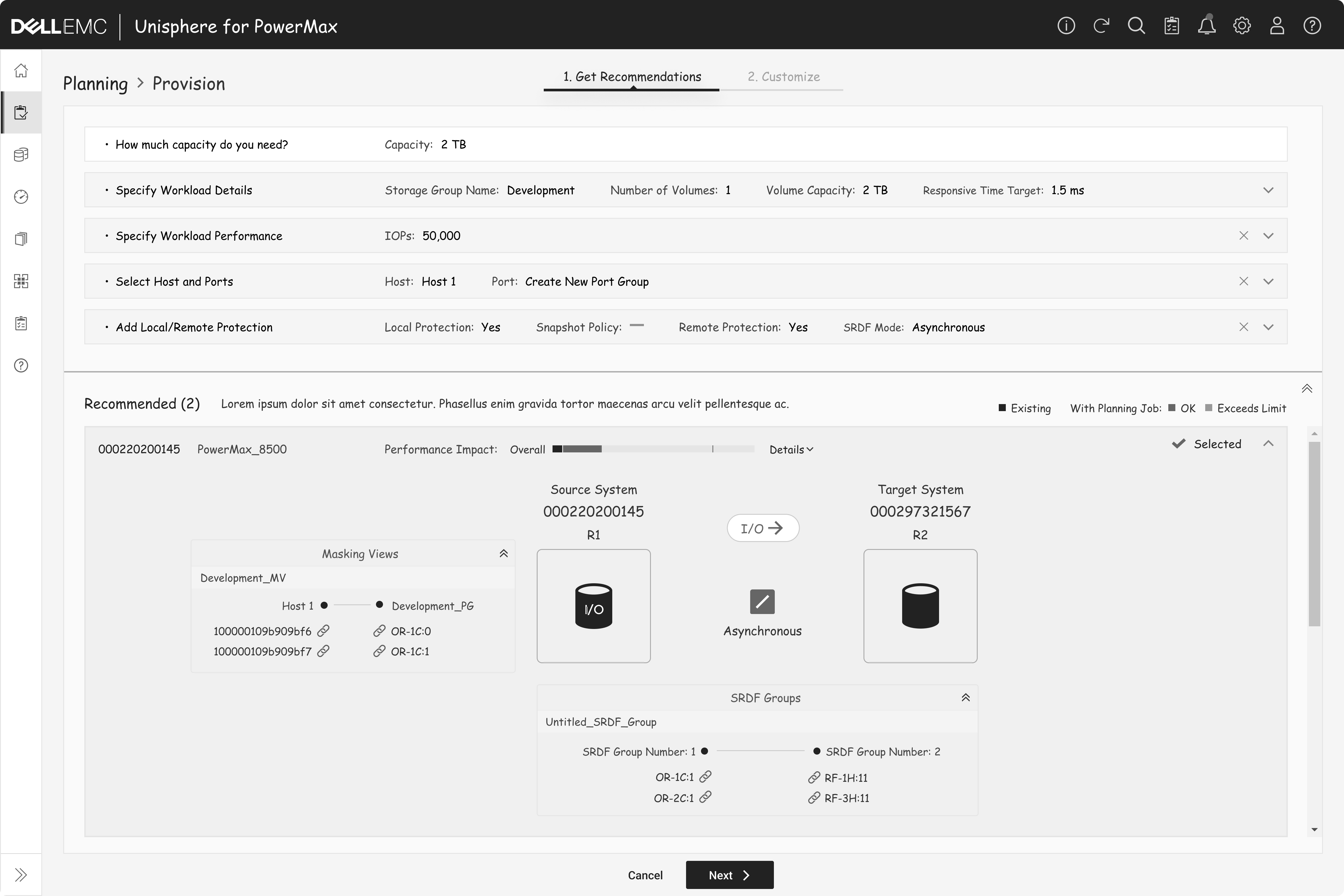 After users select a recommended system, PowerMax displays the recommended source system, masking view with host connections, the target system for replication, and the SRDF Groups required to link the two systems within a clear graphical interface.