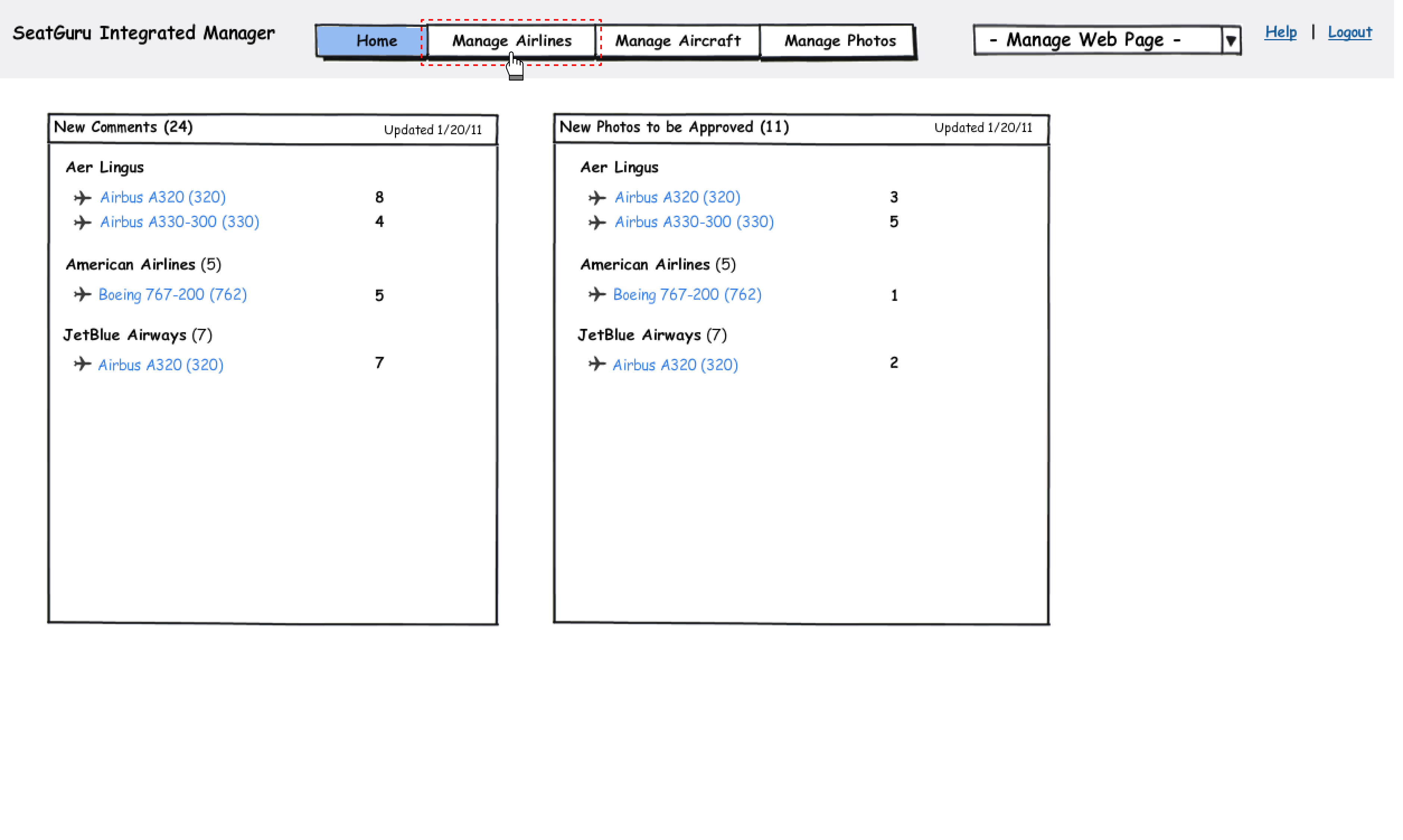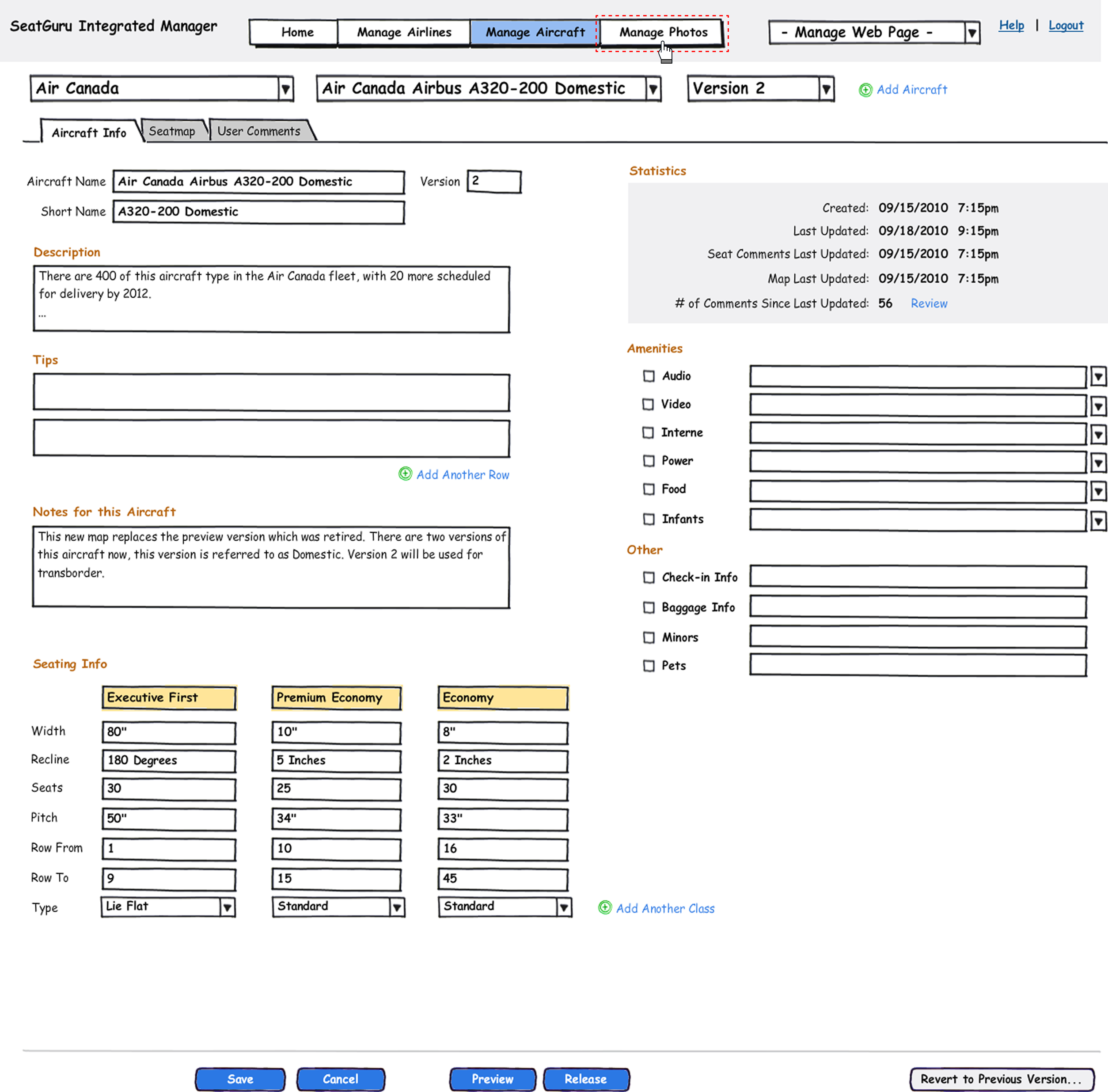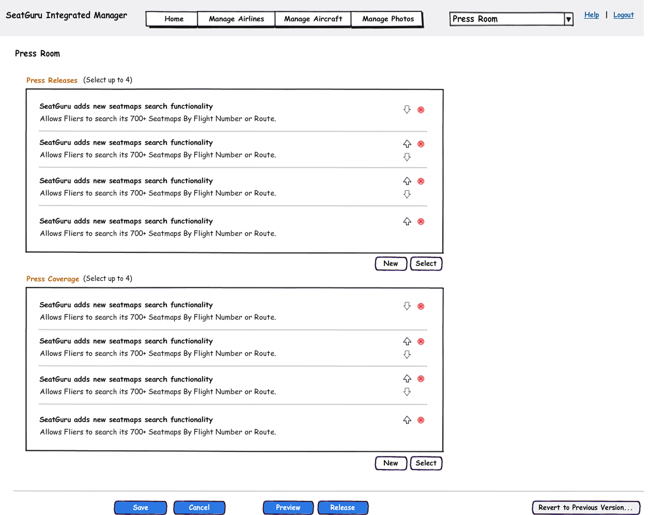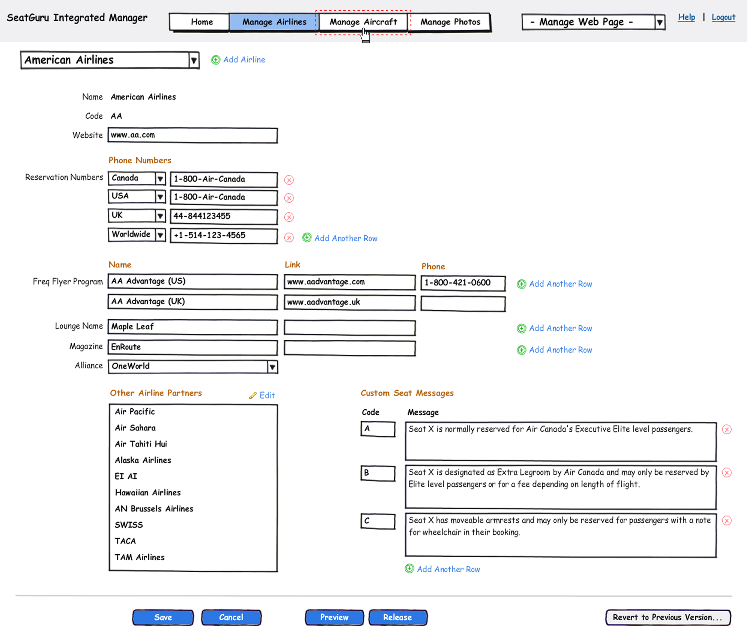 I designed an intuitive, modern interface for SeatGuru, a website that helps air travelers choose the best seats on flights. In addition, I created low-fidelity wireframes for SeatGuru Integrated Manager, a backend system to manage airlines, aircraft, seat maps, onboard amenities, frequent flyer programs, partner integrations, and related information.
