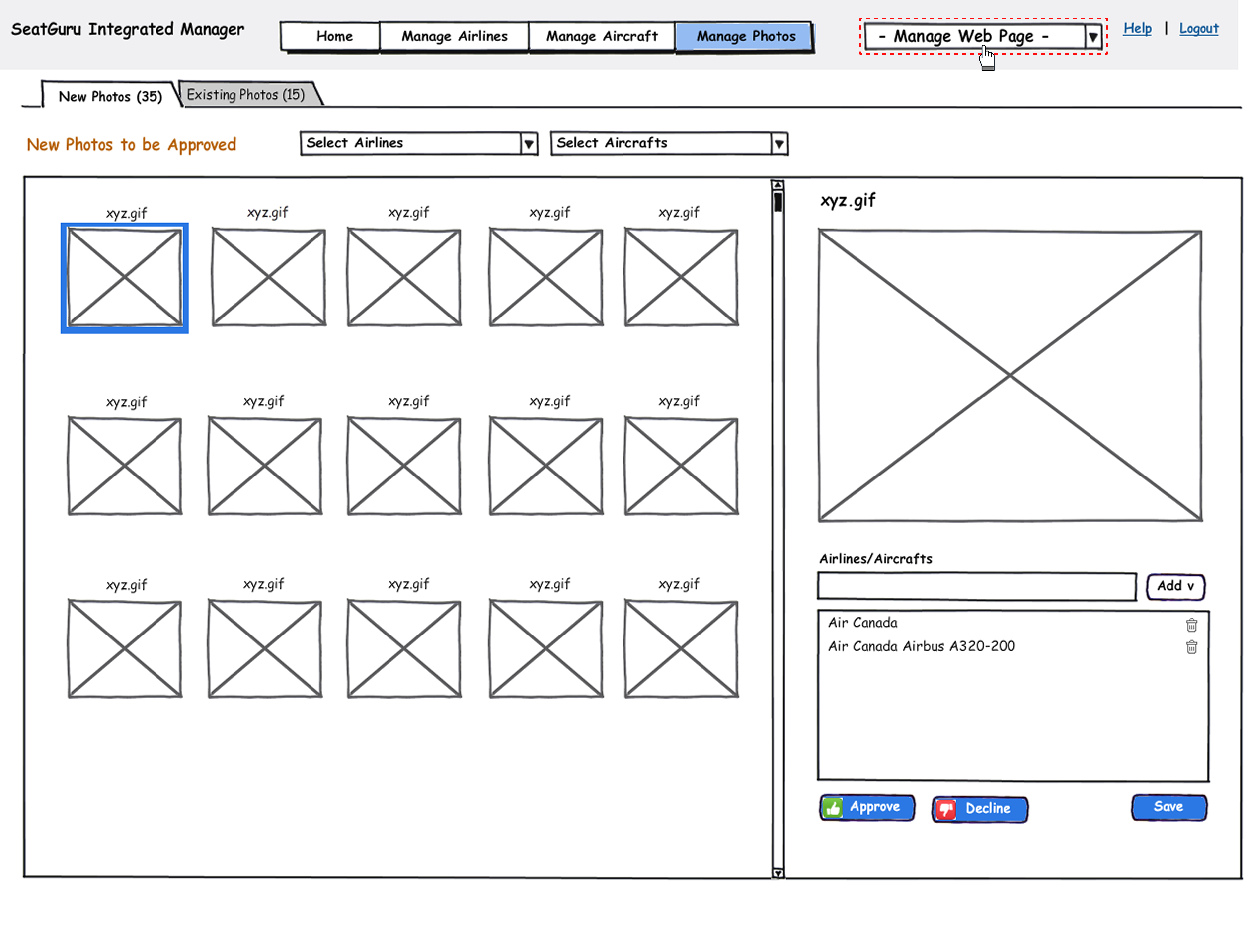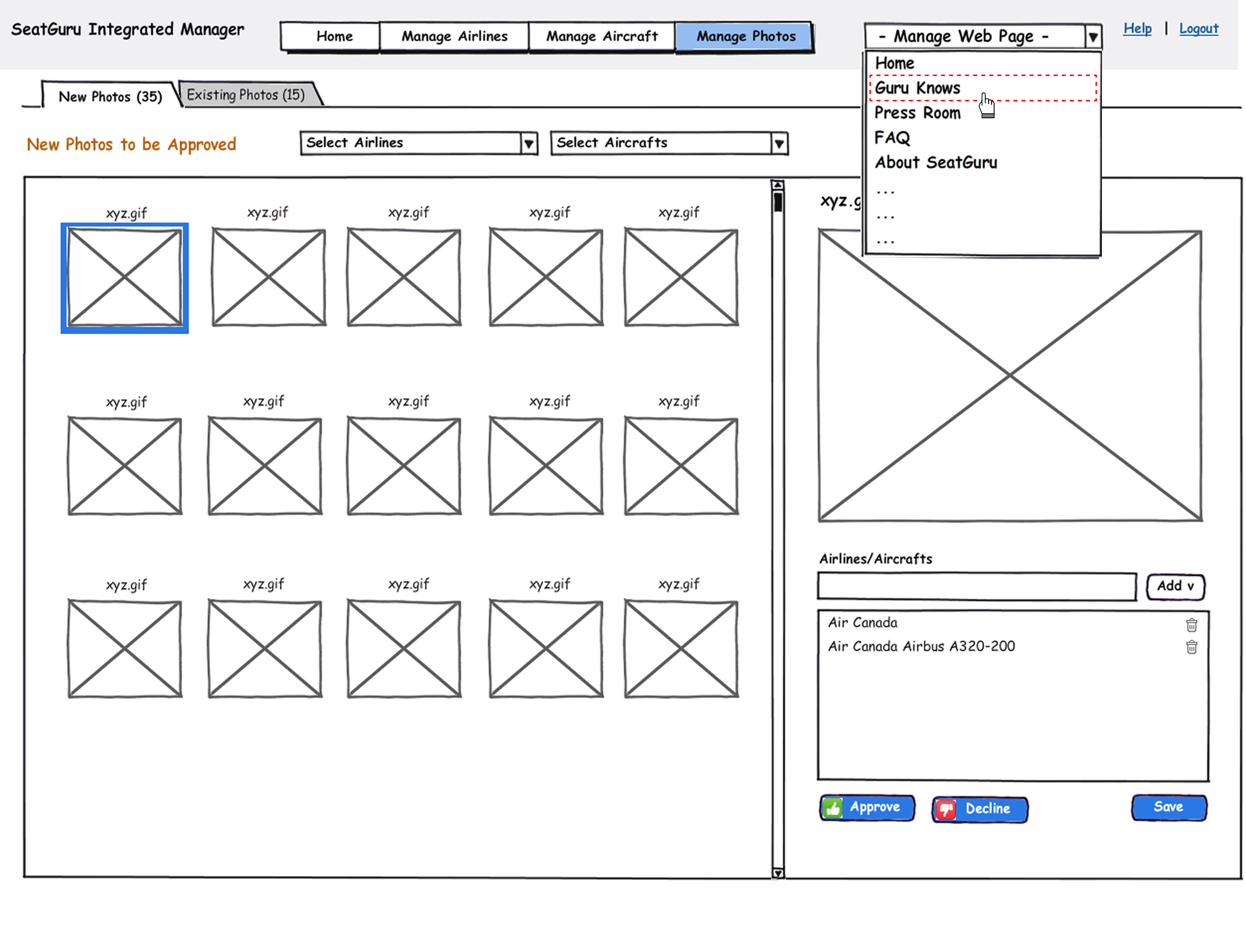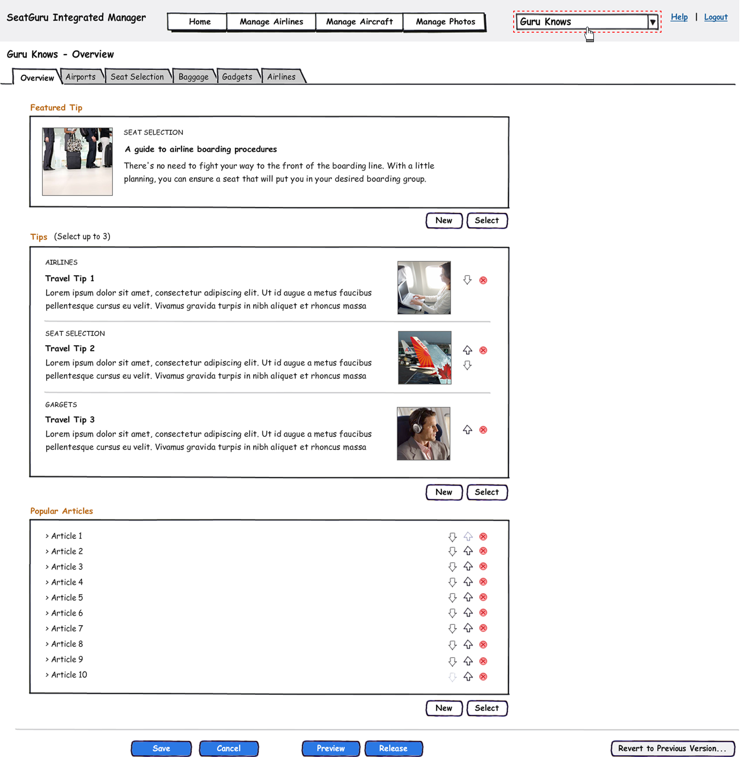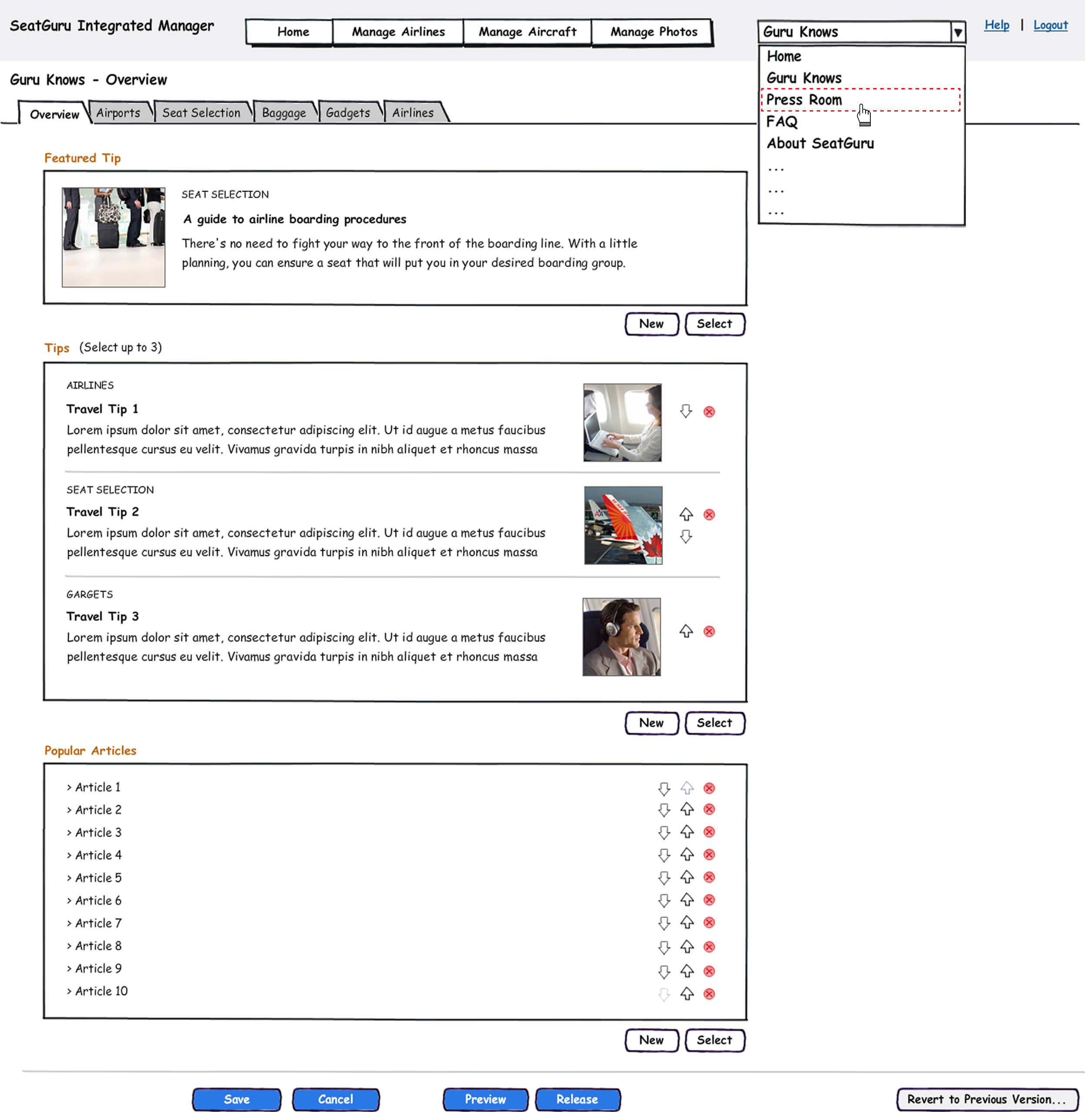 I designed an intuitive, modern interface for SeatGuru, a website that helps air travelers choose the best seats on flights. In addition, I created low-fidelity wireframes for SeatGuru Integrated Manager, a backend system to manage airlines, aircraft, seat maps, onboard amenities, frequent flyer programs, partner integrations, and related information.