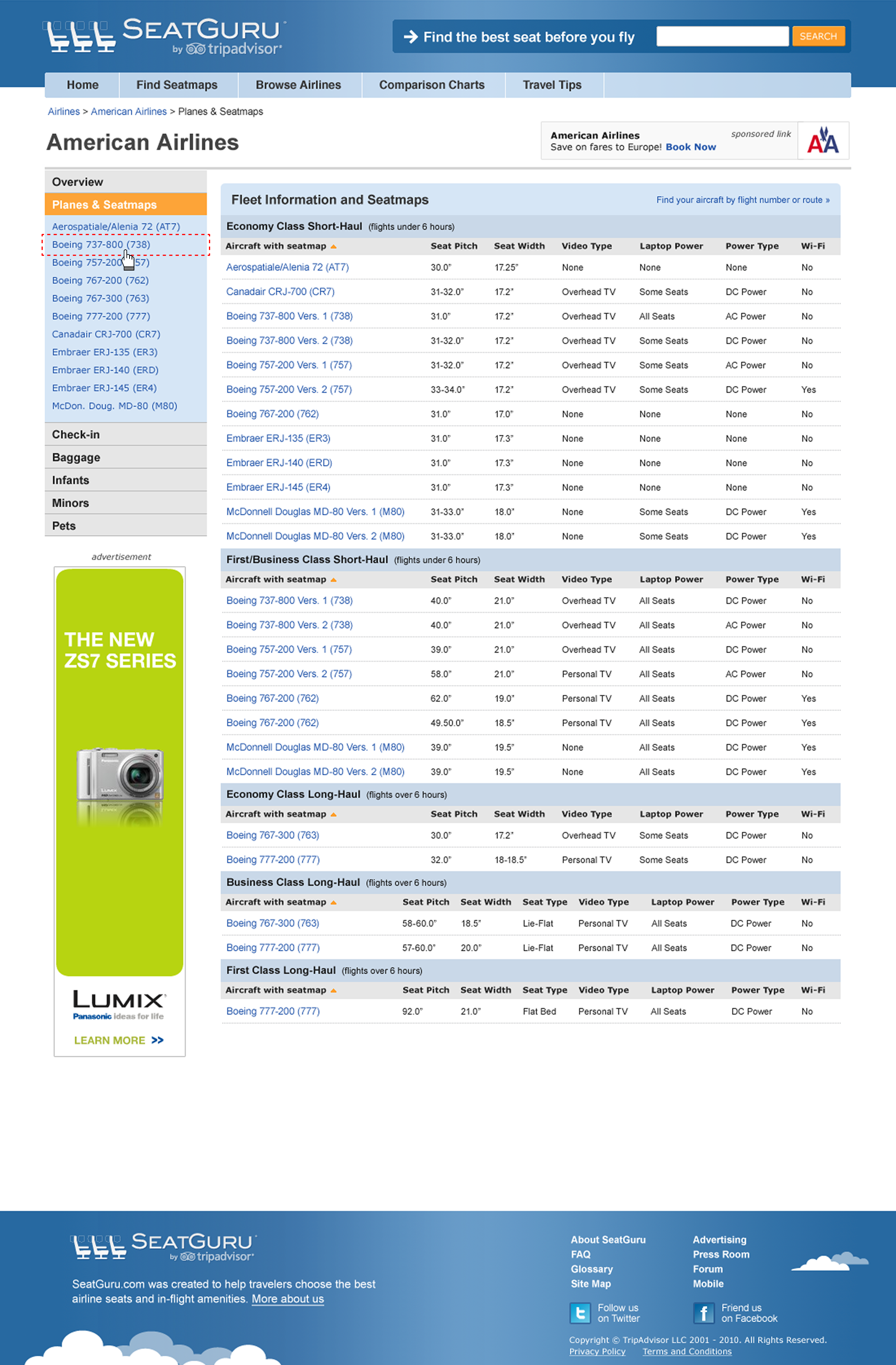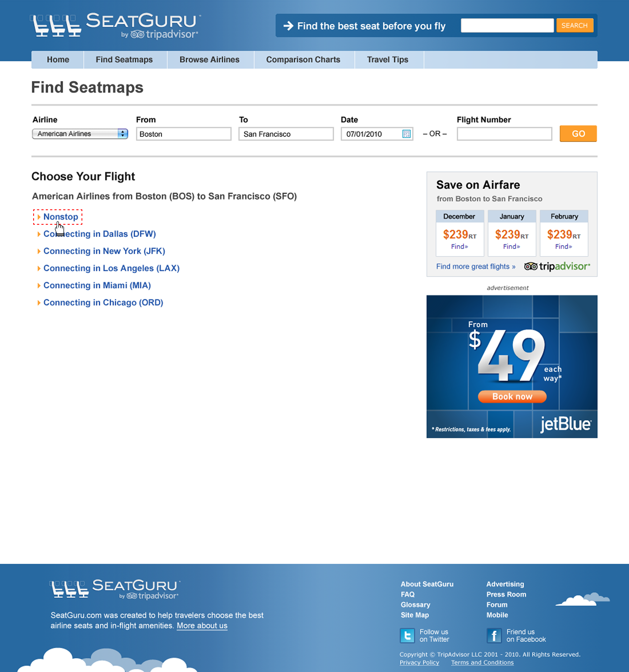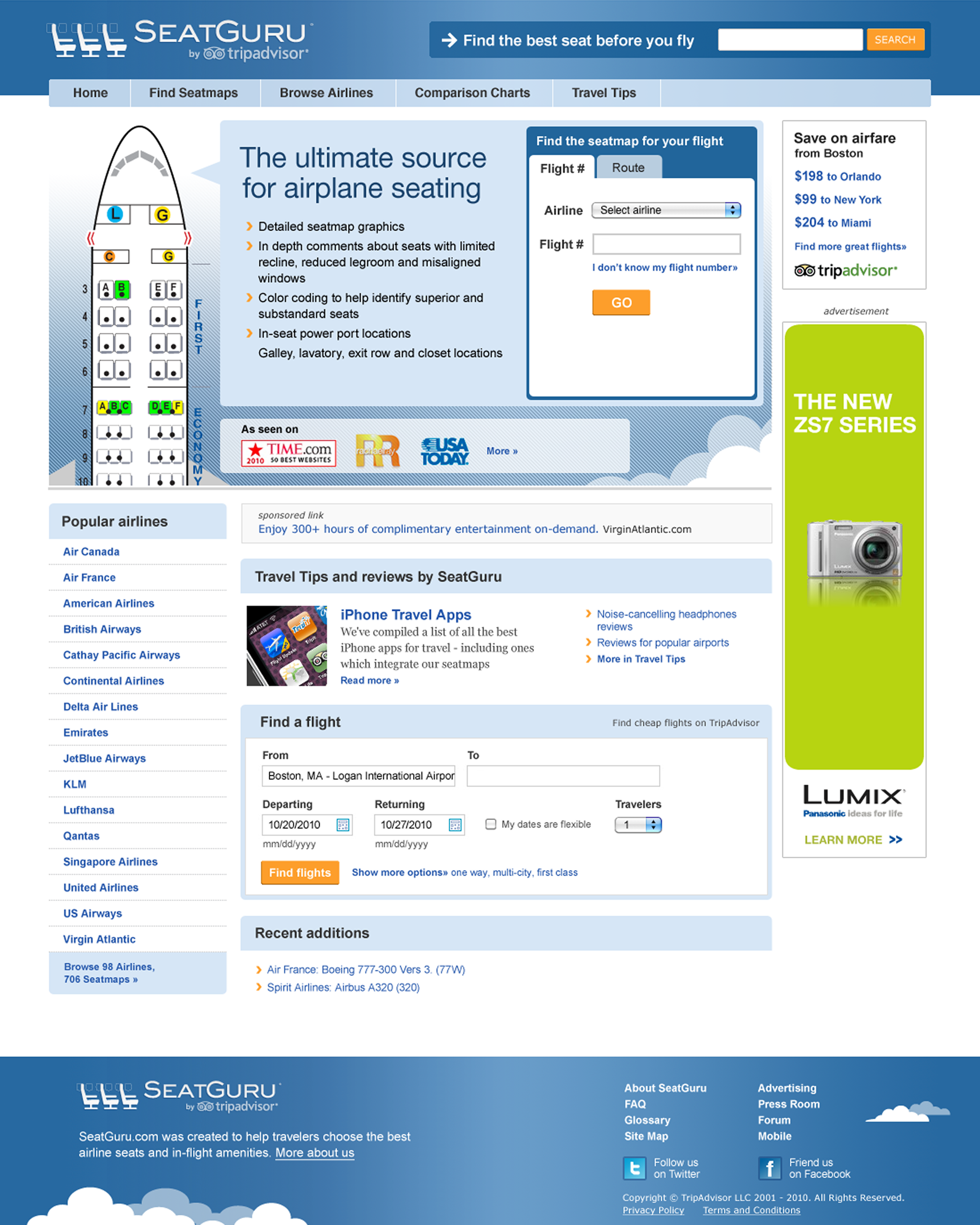 I collaborated with TripAdvisor’s design team to create SeatGuru, a website that helps air travelers choose the best seats on flights. The site featured: