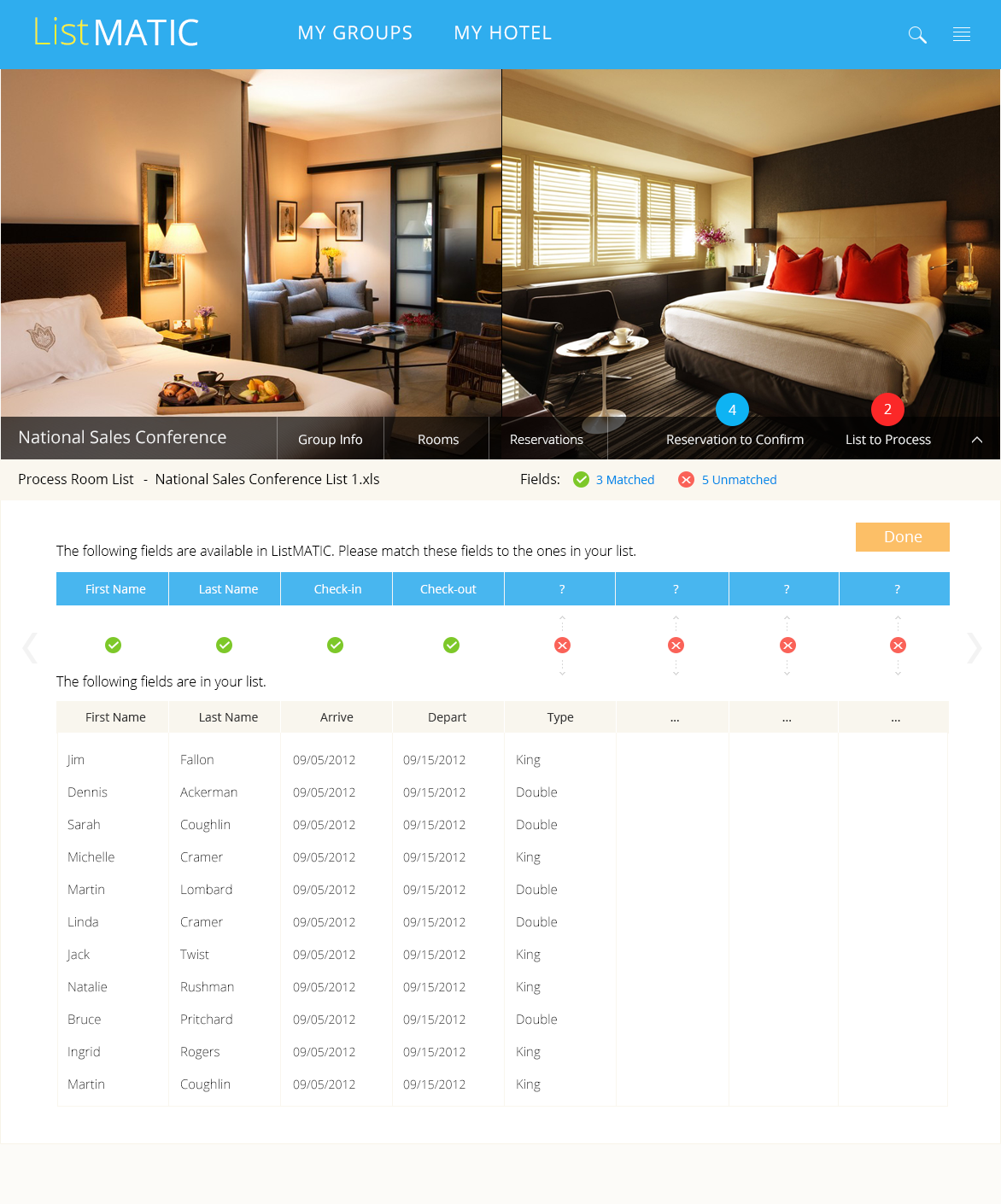 In 2012, I designed a web-based platform that enabled corporations and event planners to efficiently book and manage large blocks of hotel rooms for corporate events. Streamlined workflows allowed planners to upload attendee lists, automate room assignments, and monitor inventory in real time, reducing manual effort and booking errors while integrating seamlessly with partner hotels.