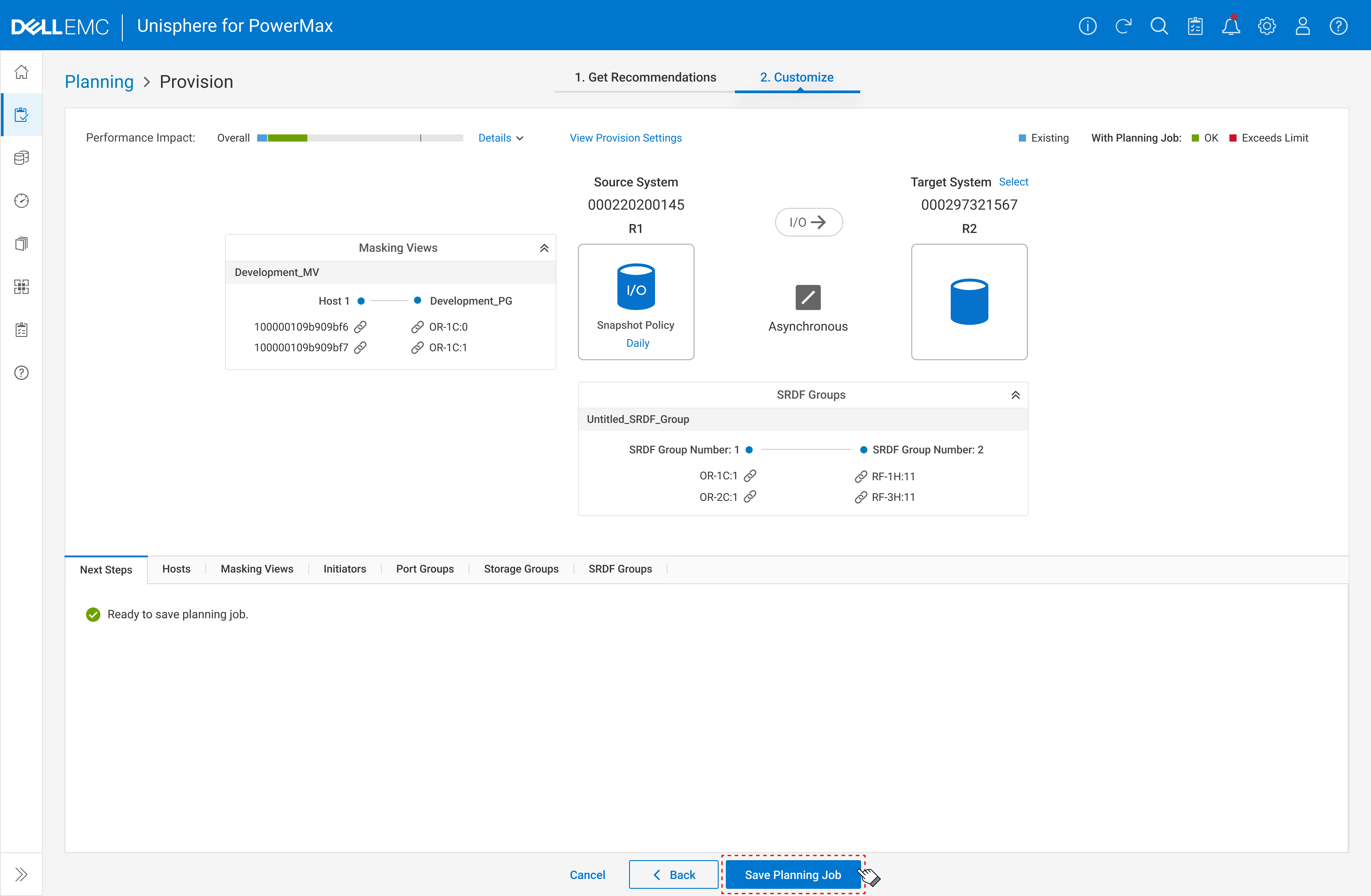 After the planning job is saved, PowerMax leverages AI to predict potential performance impacts on the systems. Based on these predictions, users can then decide whether to proceed with implementation.