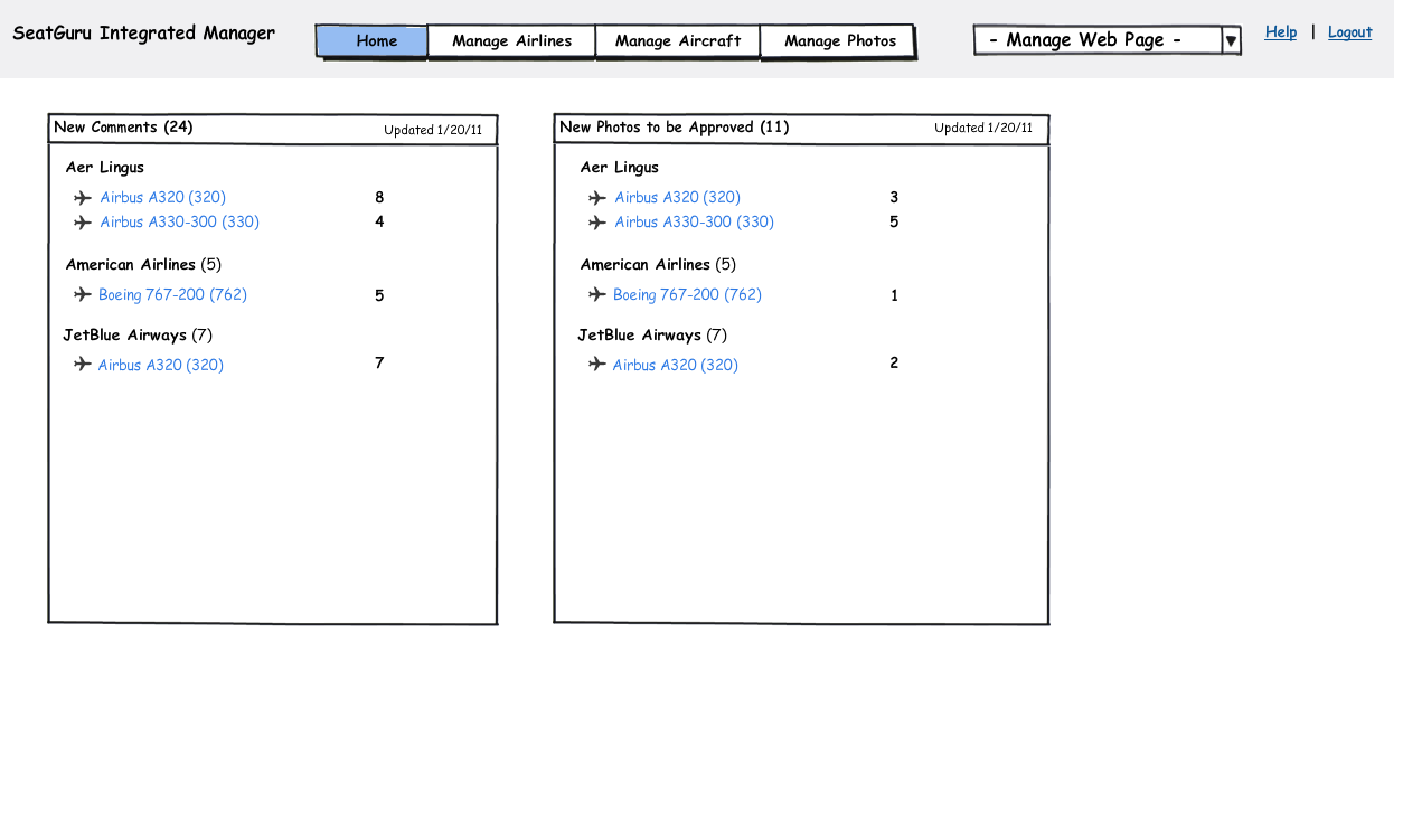 I designed an intuitive, modern interface for SeatGuru, a website that helps air travelers choose the best seats on flights. In addition, I created low-fidelity wireframes for SeatGuru Integrated Manager, a backend system to manage airlines, aircraft, seat maps, onboard amenities, frequent flyer programs, partner integrations, and related information.